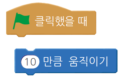 그 다음은 곰돌이를 앞으로 움직여야 합니다. 원하는 명령어는 10가지 블록 모음(동작, 형태, 소리, 펜, 데이터&추가블록, 이벤트, 제어, 관찰, 연산, 로보트) 중에서 어디에 있을지 한 번 생각해봅시다. 움직이는 것이니 동작에 있겠죠? 동작을 누르면 <~만큼 움직이기> 명령어 블록이 나옵니다. 이것을 드래그하여 다음과 같이 코딩합니다.