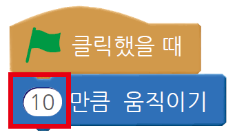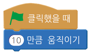 그 다음은 곰돌이를 앞으로 움직여야 합니다. 원하는 명령어는 10가지 블록 모음(동작, 형태, 소리, 펜, 데이터&추가블록, 이벤트, 제어, 관찰, 연산, 로보트) 중에서 어디에 있을지 한 번 생각해봅시다. 움직이는 것이니 동작에 있겠죠? 동작을 누르면 <~만큼 움직이기> 명령어 블록이 나옵니다. 이것을 드래그하여 다음과 같이 코딩합니다.