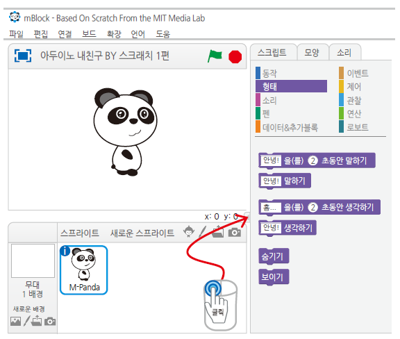 말하기 블록은 형태 블록 모음에 있습니다. 보라색 블록이니 블록 모음 중에서 보란색인 것을 찾으면 되겠죠? 곰돌이는 100만큼 움직이고 안녕이라고 말합니다. 그리고 1초 기다리고 자신의 이름을 말합니다. <~초 기다리기> 명령어를 이용하면 곰돌이가 많은 이야기를 할 수 있게 프로그램을 만들 수 있습니다. 곰돌이가 멋진 이야기꾼이 되어서 재미있는 이야기를 말해주는 프로그램을 한 번 만들어봅시다. 스크래치로 아주 간단한 프로그램을 하나 만들었습니다. 이제 우리는 코딩의 세계로 한 걸음 더 가까이 다가갔습니다.