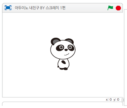 그리고 한 번 초록색 깃발을 눌러보세요. 곰돌이가 조금 움직이죠? 그런데 두 개의 블록이 서로 떨어져 있다면 어떻게 될까요?